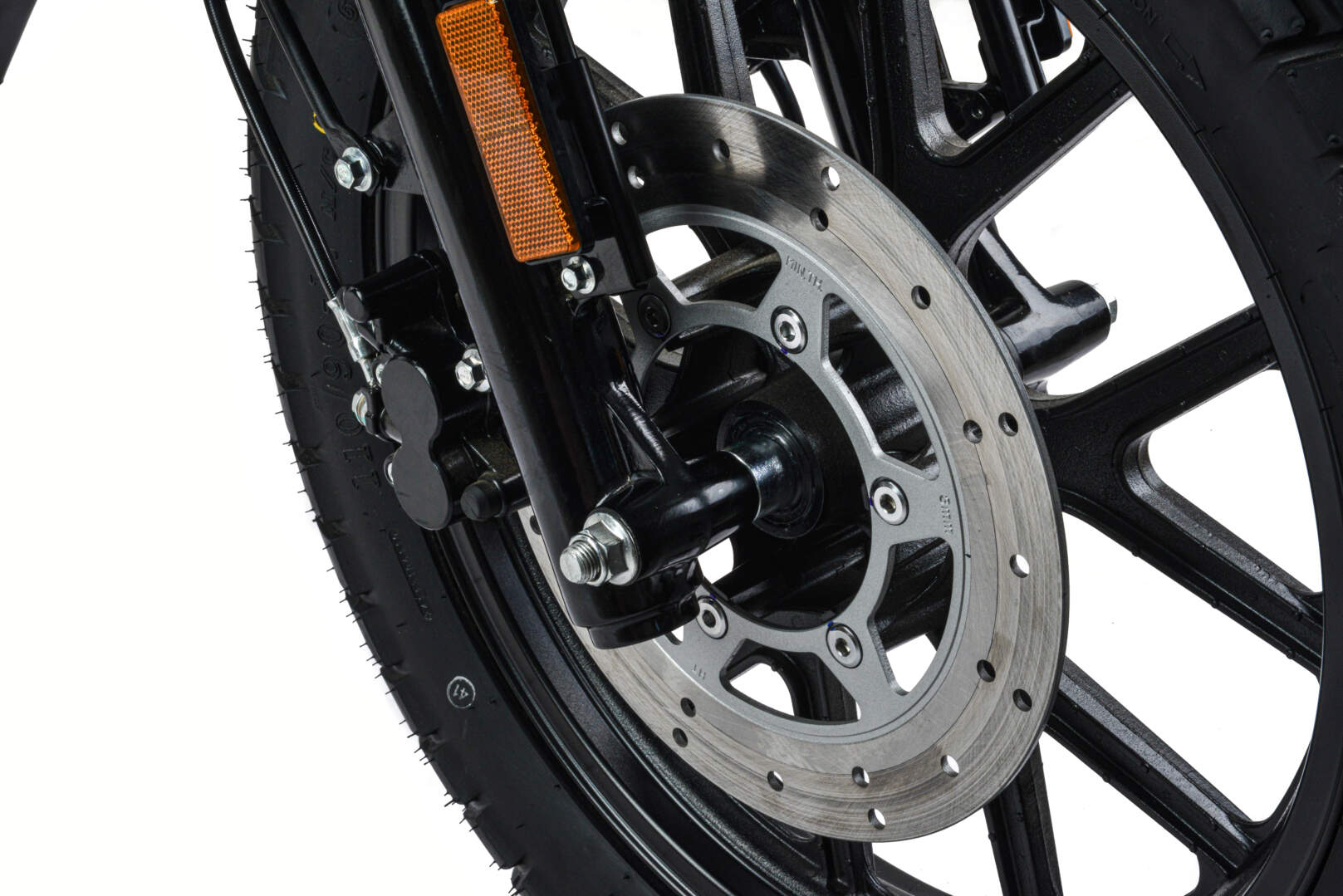 Передний увеличенный тормозной диск в сочетании с качественной тормозной системой позволяет максимально уменьшить тормозной путь.